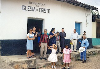 The front of the current church building in Santa Maria del Real, with some members gathering before the Sunday morning worship