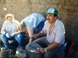 Bending the rebar into rectangular rings required a stump in the shade and some staples strategically placed, plus a lot of strength