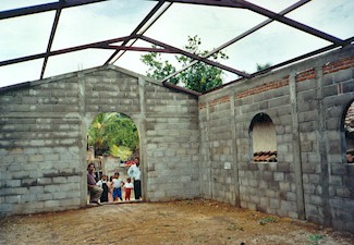 After the rainy season in the spring of 2000, you can see the water on the blocks. The roof superstructure is in place, but still needs permanent materials. Also needed is a floor.